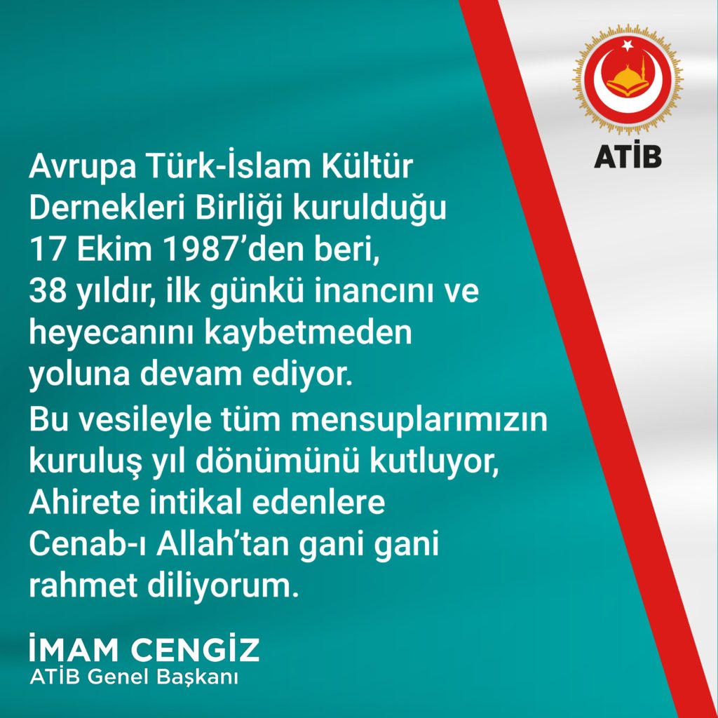 Botschaft zum 38. Gründungsjubiläum von Imam Cengiz, Präsident der ATIB Unser Zuhause, die in der Gesellschaft kurz als Türkisch-Islamische Union (ATIB) bekannte Union der Türkisch-Islamischen Kulturvereine in Europa, blickt mit Stolz und Freude auf 37 Jahre ihrer von unseren Älteren mit dem Leitsatz „Wo das Recht ist, sind wir“ begonnenen gesegneten Reise zurück. In Einheit […]